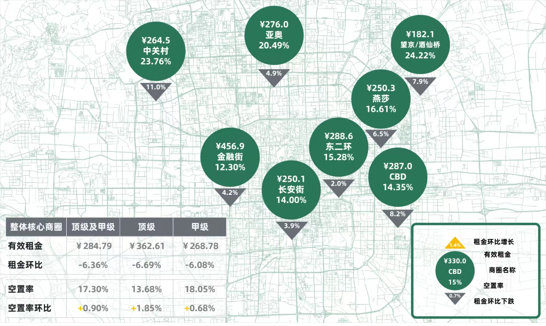 除東二環和長安街商圈成交租金環比上季度降幅分別為2.0和3.9個百分點外,其他商圈成交租金跌幅均超過4.0個百分點,中關村、CBD、望京/酒仙橋商圈成交租金降幅分別為11.0%、8.2%和7.9%。
