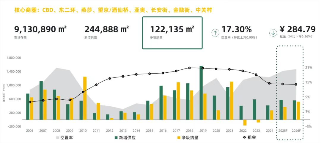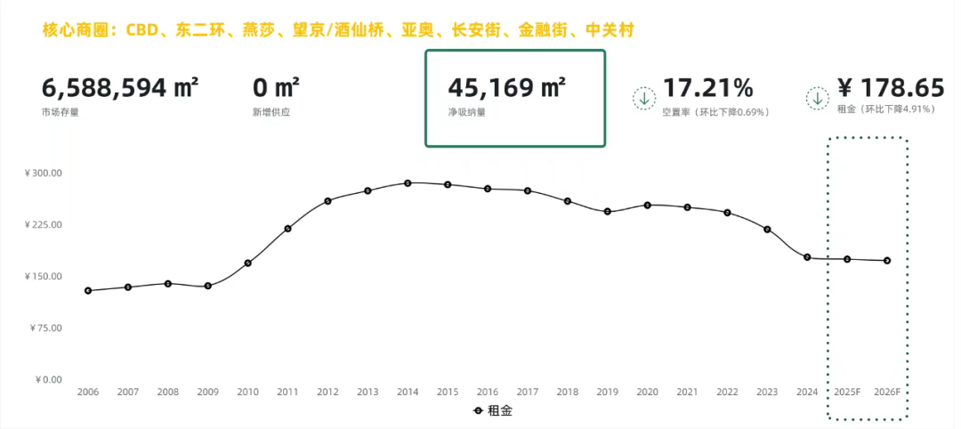 凈吸納量層面 ,全年整體市場凈吸納量為497,159平方米,同比2023年全年上升67萬平方米。隨著四季度更多存量投入市場及租金的連續下行,不斷刺激市場成交,凈吸納量表現更加活躍,多個商圈凈吸納量顯著提升。中關村、麗澤、亞奧商圈全年累計凈吸納量均在10萬平方米左右;東二環、燕莎、CBD商圈全年累計凈吸納量呈現負值。市場短期內還將向租戶端傾斜,這也是企業實現降本增效的良好機遇。
